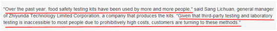 隨著中國食品安全事件的頻繁發(fā)生,越來越多的消費(fèi)者通過購買食品安全快速檢測產(chǎn)品進(jìn)行自我保護(hù),這些產(chǎn)品可以檢測出食物中是否存在有害毒素、病原體和食品污染物。雖然專家們警告說這些快檢產(chǎn)品不能保證結(jié)果的絕對準(zhǔn)確,但仍有很多消費(fèi)者爭相購買。