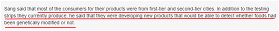“在過去的一年里,食品安全快速檢測產(chǎn)品已經(jīng)被越來越多的人使用”,??偨榻B說,“大多數(shù)人因為無法支付第三方檢測平臺和專業(yè)實驗室的高額費(fèi)用,轉(zhuǎn)而使用此類方法。目前使用這些快檢產(chǎn)品的消費(fèi)者大多來自一線和二線城市,我們一直不斷研發(fā)新產(chǎn)品,目前正在研發(fā)能夠檢測轉(zhuǎn)基因的產(chǎn)品?!?