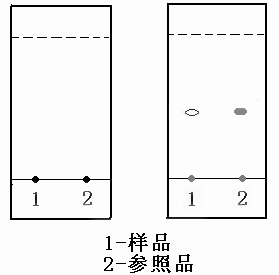 取一片硅膠板,在白色涂層面底端向上約1厘米處,用鉛筆畫一條直線,取兩點分別作為樣品和參照品的點樣點(如圖所示)。取1支毛細管,將其下端浸入樣品上清液中,停留2秒后取出,與樣品點樣點垂直接觸。點樣斑點揮干后,再重復點樣一次(斑點直徑控制在5毫米以內)。另取毛細管取參照品溶液在參照品點樣處進行點樣,晾干后備用。