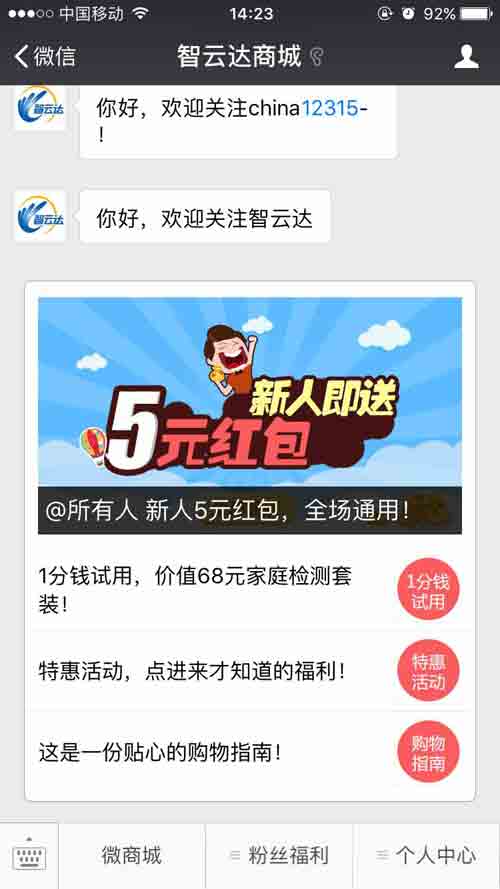 然后點擊關注頁面左下角“微商城”,即可進入商城。商城最新推出各種優惠活動和優惠券,微商城開業,一大波優惠券瘋狂送,即日起至12月30日,凡進店新人享5元紅包,全場通用。同時您可以在搜索框中輸入產品名稱或關鍵詞,快速查找您要購買的產品,點擊購買即可。