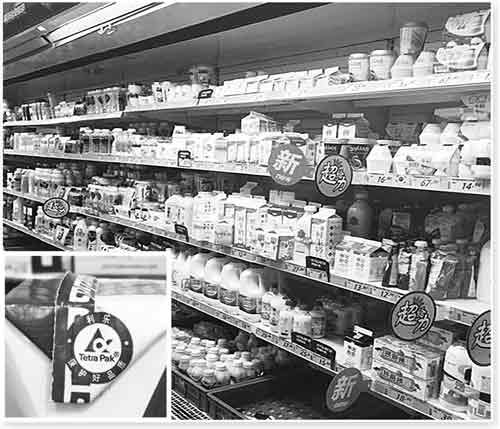 右上圖 利樂包裝讓高溫消毒的無菌奶占據(jù)壓倒性優(yōu)勢,需要冷藏保存的低溫巴氏殺菌奶受到影響。而業(yè)界公認(rèn),低溫奶營養(yǎng)價(jià)值更高,跟常溫奶占據(jù)的空間和熱鬧的促銷形成鮮明對比,品種很少。這是超市里的低溫奶專柜。經(jīng)濟(jì)日報(bào)記者 佘 穎攝
