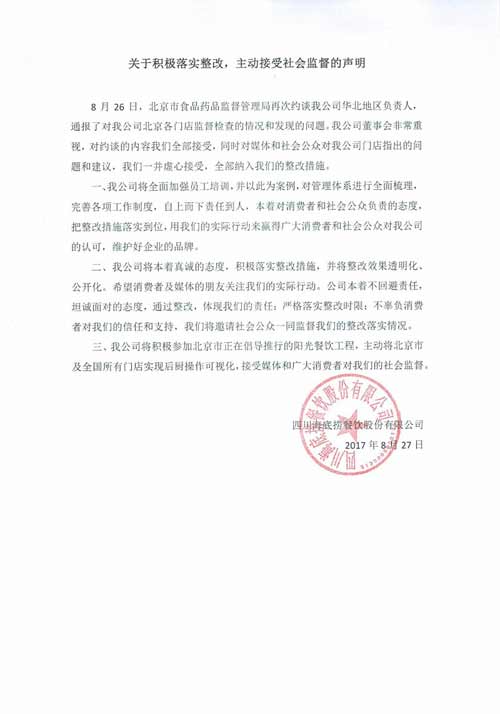 8月26日,北京市食藥監(jiān)局再次約談“海底撈”北京公司。通報(bào)了本次對(duì)“海底撈”全面檢查發(fā)現(xiàn)的問(wèn)題,包括消毒記錄不全、餐飲具混放、未戴工作帽及口罩等。市食藥監(jiān)局在約談中指出,要求“海底撈”總部落實(shí)食品安全主體責(zé)任,全面進(jìn)行限期整改,并按照《關(guān)于海底撈火鍋北京勁松店、北京太陽(yáng)宮店事件處理通報(bào)》中所承諾,主動(dòng)向社會(huì)公開(kāi)整改情況,主動(dòng)接受社會(huì)監(jiān)督。