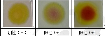 若點(diǎn)樣位置顯紫色、紫紅色、紅色、紅褐色,則可判定樣品中含有雙胍類(lèi)物質(zhì)即為陽(yáng)性(+);若顯淡黃色、黃色則為陰性(-)。
