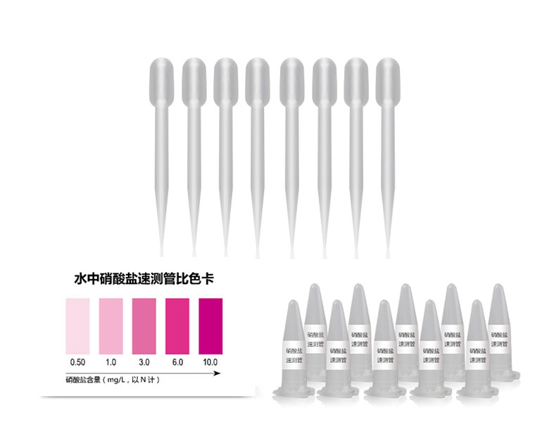 硝酸鹽是含氮有機(jī)物氧化分解的最終產(chǎn)物。如水體中僅有硝酸鹽含量增高,氨氮、亞硝酸鹽氮含量均低甚至沒有,說明污染時(shí)間已久,現(xiàn)已趨向自凈。此外,水中的硝酸鹽也可直接來自地層。本速測管適用于水中硝酸鹽的快速檢測。