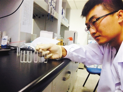 隨后實驗人員檢測泡椒鳳爪是否加入了超標的防腐劑山梨酸。稱取5克樣品,加蒸餾水,搗成勻漿過濾,吸取2ml溶液到比色管中,加山梨酸試劑,沸水加熱后冷卻,再倒入比色皿中。此時6種樣品液的顏色有了不同,5種樣品顏色沒變,1種樣品液的顏色呈現出淺粉色。