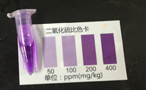 然后取一支10mL比色管,加入1mL樣品液,加入C溶液80μL,加蒸餾水至10mL刻度線,加入D溶液0.5mL,搖勻,開蓋靜置10min,加入F溶液0.5mL,迅速蓋塞顛倒兩次,迅速加入E溶液1mL,蓋塞混勻,靜置7min。處理完畢后作為樣品管。空白管內加入蒸餾水替代樣品液,其余步驟與樣品管相同,之后先用空白管校準,再檢測樣品管得到枸杞中二氧化硫含量顯示只為1890.1 mg/kg超出了我國的國家標準,為不合格產品。