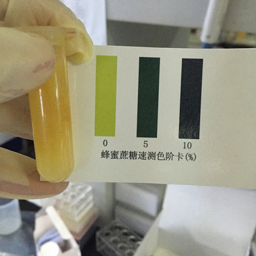 吸取稀釋液2滴到另外一支離心管中,加入10滴測試劑,搖動幾次后放入水浴鍋中沸水浴5min,水浴完畢后取出,加入1.5ml蒸餾水。之后與比色卡比對,讀取含量,我們可以看到含量超過60%為真蜂蜜。