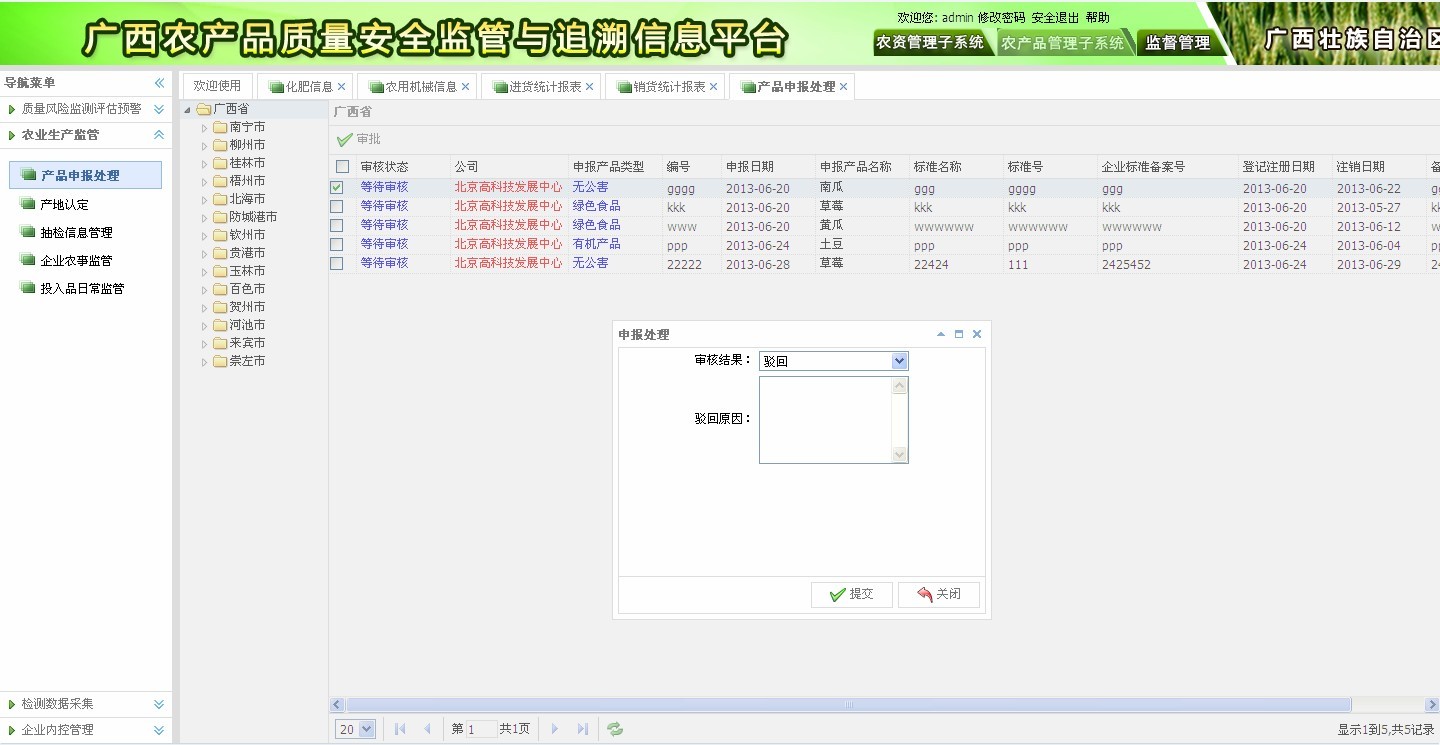 監(jiān)管部門負(fù)責(zé)處理三品產(chǎn)品的認(rèn)證審核。審批結(jié)果包括通過(guò)和駁回,如此申報(bào)駁回需填寫(xiě)駁回原因。如圖2-1所示