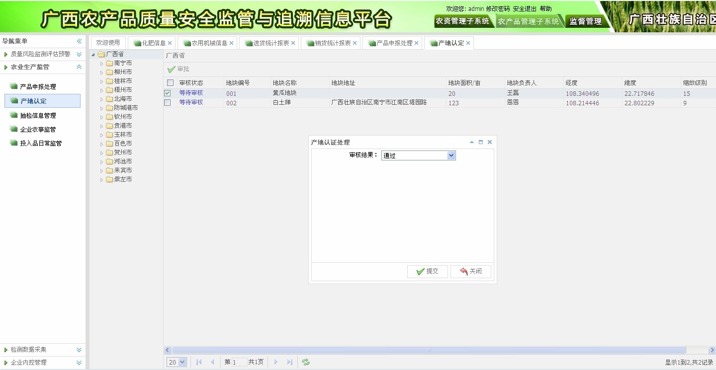 ? 抽檢信息管理:行業(yè)例行監(jiān)測(cè)抽檢,專項(xiàng)風(fēng)險(xiǎn)監(jiān)測(cè),所含信息包括產(chǎn)地、生產(chǎn)者、品種、檢測(cè)結(jié)果、處理情況、檢測(cè)員等信息。如圖2-3所示
