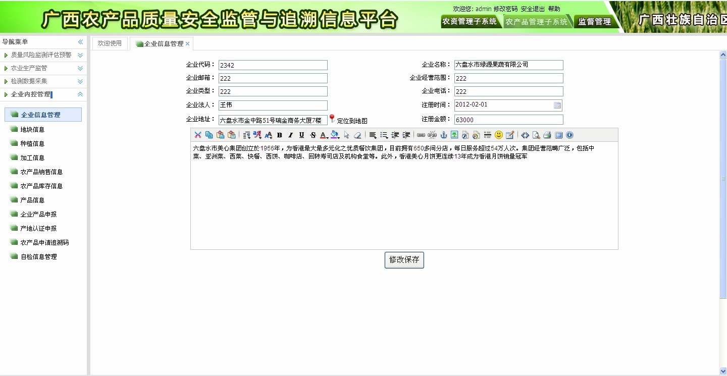 以農(nóng)產(chǎn)品會(huì)員用戶登錄系統(tǒng),監(jiān)管企業(yè)的基礎(chǔ)信息,如有變動(dòng)在此處修改,方便用戶的操作。如圖4-1所示